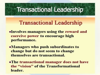 The document discusses various aspects of leadership and management, highlighting the differences between leaders and managers in terms of influence, flexibility, and employee relationships. It outlines different leadership styles, including authoritarian, paternalistic, democratic, and laissez-faire, and explains how a leader's traits, such as charisma and emotional stability, play a crucial role in their effectiveness. Furthermore, it differentiates between transformational and transactional leadership, emphasizing the importance of adapting leadership approaches based on situational factors.