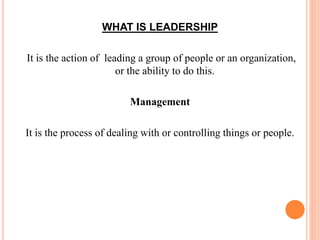 This document provides an overview of leadership and how it can be developed. It defines leadership as leading a group and management as dealing with or controlling things and people. It notes that successful businesses need both strong leadership and management. Leadership is about vision and goals while management focuses on day-to-day administration. The document also discusses models for reflection on experiences, how experiences and education can develop leadership, different training programs, and methods for assessing leadership abilities.
