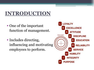 This document discusses various concepts and theories related to leadership. It defines leadership as the ability to influence others and motivate them towards common goals. Several leadership styles are described, including autocratic, democratic, and laissez-faire. Trait theory suggests leaders are born with certain qualities, while behavioural theory believes leadership can be learned. Contingency theory proposes that the most effective leadership style depends on internal and external situational factors. Fiedler's contingency model and the path-goal theory are contingency theories discussed in the document.