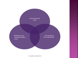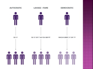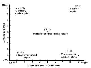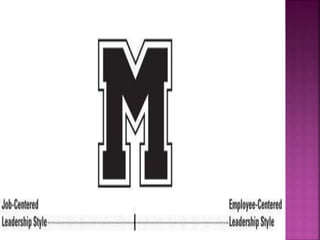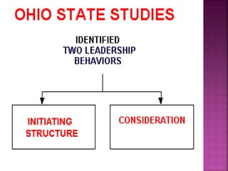 This document discusses various theories of leadership, including trait theory and behavioral theory. It describes behavioral theory as assuming that leadership can be learned rather than inherent. Two major behavioral leadership studies are discussed: the Michigan Leadership Studies, which looked at job-centered and employee-centered leadership, and the Ohio State Leadership Studies, which examined initiating structure behavior and consideration behavior. Blake and Mouton's Managerial Grid is also summarized, outlining five leadership styles based on concern for production and people.