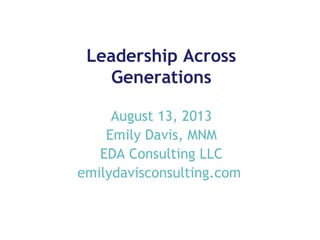 The document discusses leadership dynamics across generations, identifying challenges and strategies for enhancing leadership effectiveness in multigenerational organizations. It highlights the distinct values and work styles of different generations, such as Traditionalists, Baby Boomers, Generation X, and Millennials, while proposing solutions to address the leadership gap and improve intergenerational collaboration. Additionally, it provides actionable steps and resources for organizations to foster inclusive leadership and enhance engagement across various age groups.