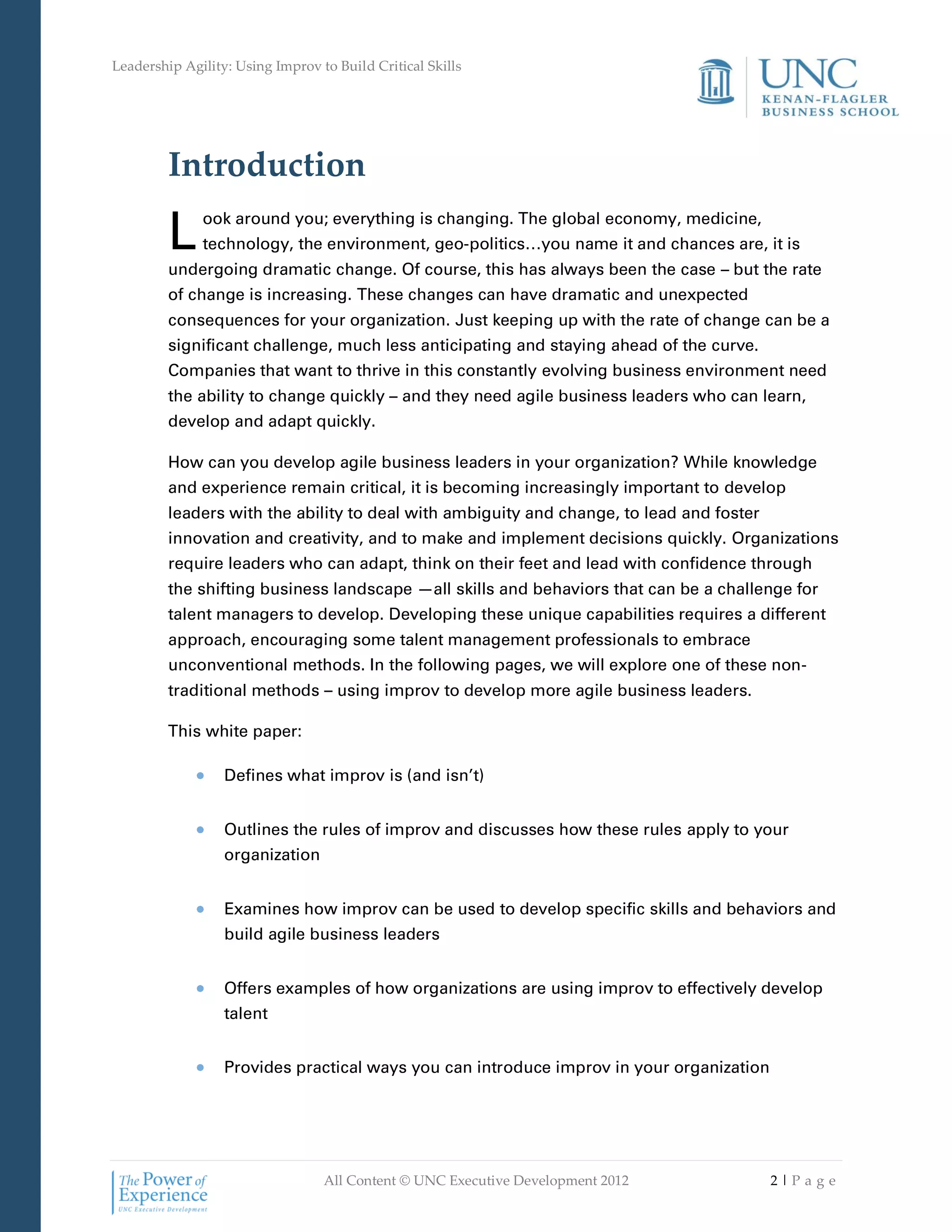 The document discusses the importance of developing agile leaders to navigate rapid changes in the business environment and presents improvisation (improv) as a unique method to build critical leadership skills. It outlines the principles of improv, such as acceptance, collaboration, and viewing mistakes as opportunities, and explains how these principles can foster creativity, adaptability, and effective communication in organizations. The white paper concludes by emphasizing the value of improv in talent development, enabling leaders to handle uncertainty and promote teamwork.
