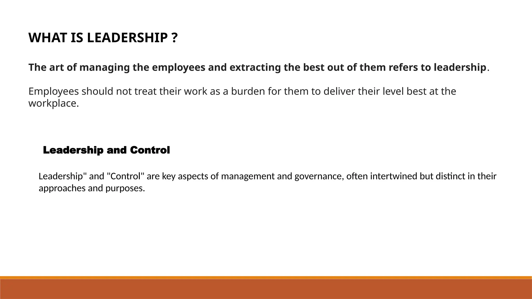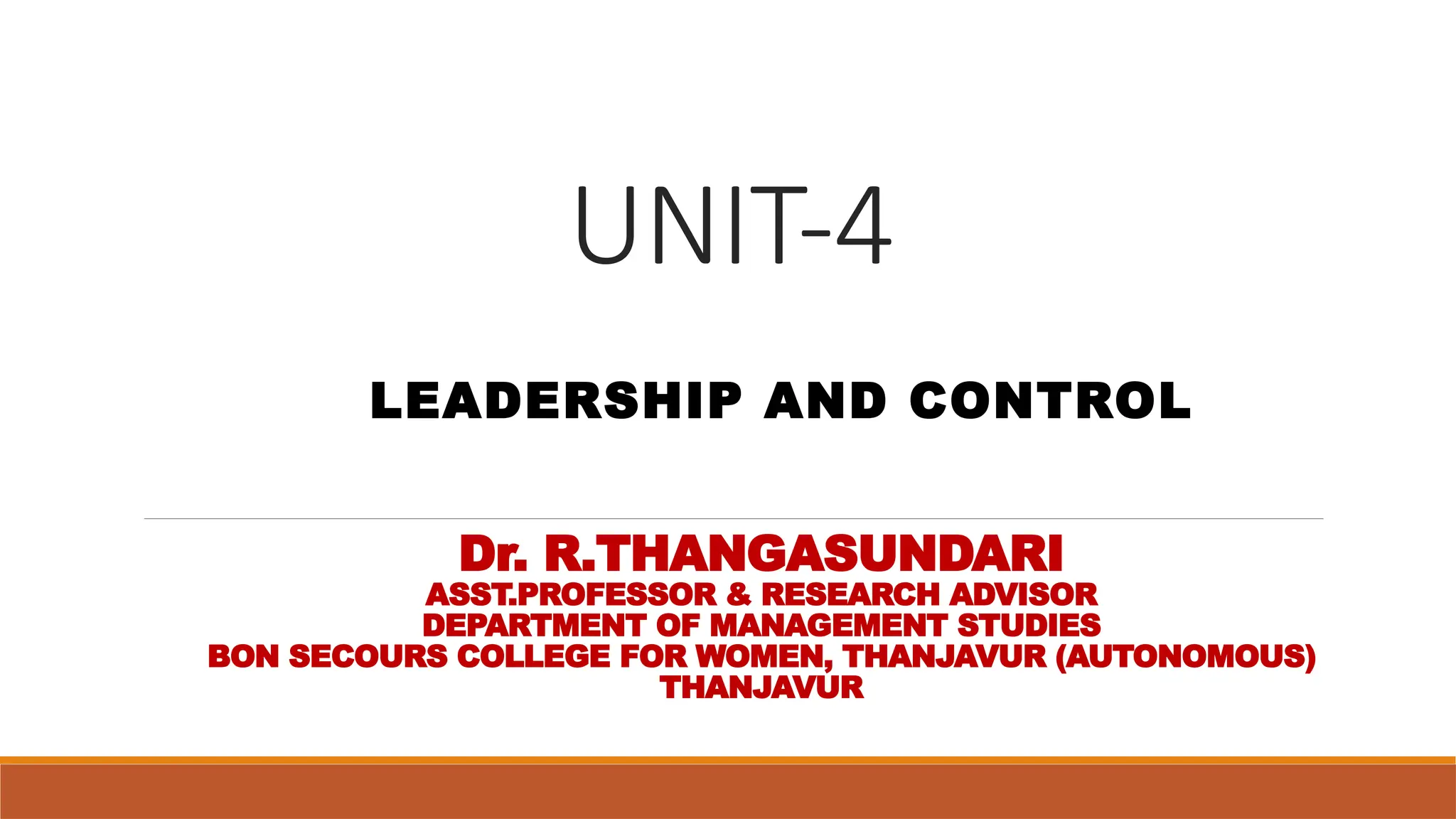 The document discusses the concepts of leadership and control within management, highlighting leadership as the process of influencing individuals towards common goals, while control involves monitoring and managing organizational performance. Various leadership styles, including autocratic, democratic, transformational, and servant leadership, are outlined alongside their communication approaches and effectiveness. It emphasizes the complementary relationship between leadership and control, explaining how both are essential for achieving organizational objectives efficiently.
