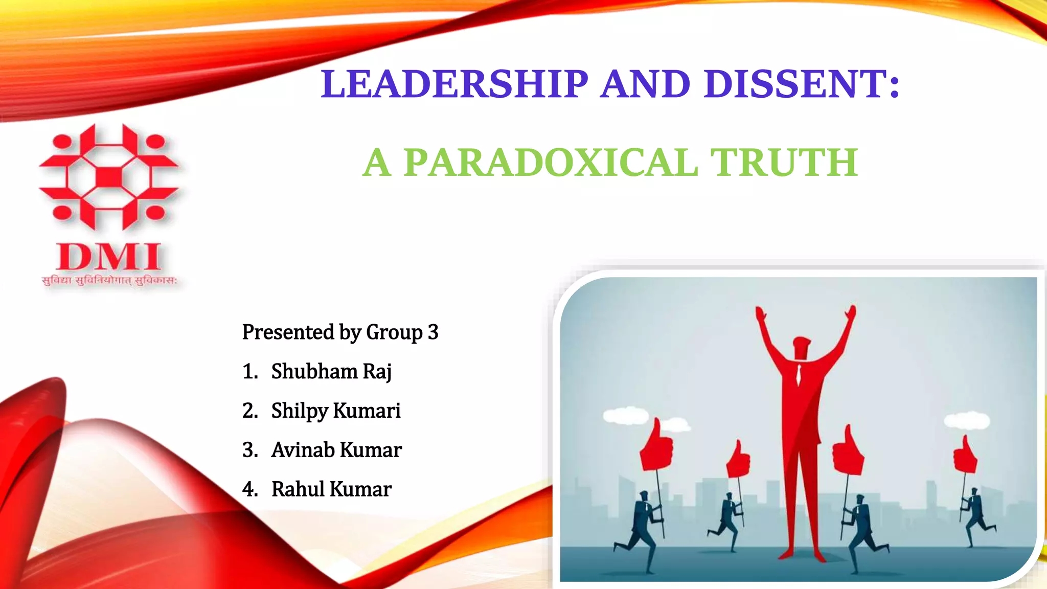 The document discusses leadership and dissent. It defines leadership as influencing a group toward achieving goals and vision. Good leaders challenge the status quo, create visions of the future, and inspire others. Dissent is the expression of disagreement with policies and practices. Dissent is multifaceted and multilayered, enriching leadership by pointing out flaws. While dissent can be lauded when successful, dissenters are often ostracized, threatened, or punished for their views. The document argues that some level of dissent is necessary for flexibility, but too little risks tyranny while too much risks chaos, so the optimum level is hard to determine but protecting all non-violent dissent helps ensure useful dissent.