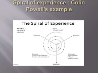 The document discusses leadership development through experience and education. It explains that leadership develops most effectively when experience involves the three processes of action, observation, and reflection. Perception plays a key role in this "spiral of experience" by influencing how people observe and reflect on their experiences. Reflection is important for leadership development, especially through double-loop learning. Both formal education and on-the-job experiences can foster leadership skills if approached systematically using tools like the action-observation-reflection model.