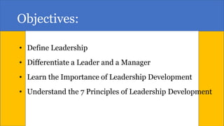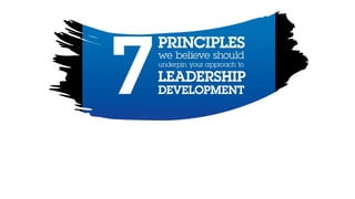 The document discusses the significance of leadership development, emphasizing that leadership is a process of social influence rather than authority or titles. It outlines seven key principles of effective leadership development, including the need for contextual approaches, active support from senior leadership, strategic alignment, the importance of conversations, the learnability of leadership skills, and the measurement of leadership effectiveness. Ultimately, it underscores the importance of investing in leadership development to adapt to a changing workplace and enhance organizational success.