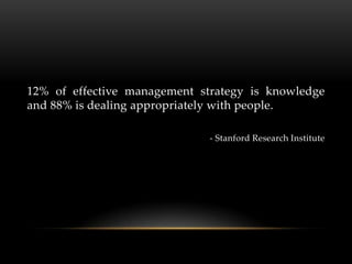 This document discusses leadership and emotional intelligence. It defines key differences between managers and leaders, highlighting that leaders focus more on people while managers focus more on systems and structure. It also outlines various challenges leaders may face, including external challenges from situations and people, as well as internal challenges stemming from insecurities or inability to be objective. The document emphasizes that emotional intelligence is important for leaders to connect with their people and motivate them. It provides frameworks for measuring emotional intelligence competencies like interpersonal skills, adaptability, stress management, and general mood/state of mind.