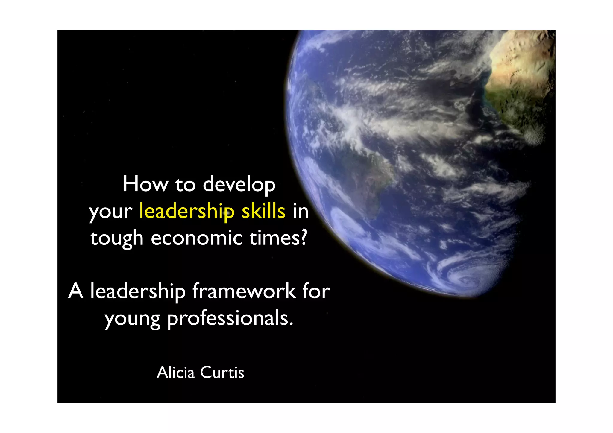 This document provides a framework for developing leadership skills for young professionals. It includes sections on discovering your strengths and power peaks, imagining your future, using social media for communication, acting like an entrepreneur, accessing mentoring, giving powerful presentations, and leading a tribe. The overall framework centers around mindsets, branding, and thinking, communicating, and taking action.