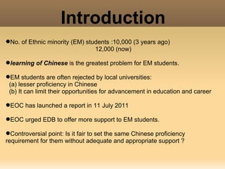 The document outlines a presentation on multicultural education. It discusses the EDB's policy for ethnic minority students, studies conducted on their education experiences, and challenges they face including a lack of Chinese language proficiency. Case studies show students struggle due to few support services. The EOC urges more support for ethnic minority students, including alternative curricula and language programs. Teachers must recognize their own biases and understand students' cultural backgrounds to effectively support diverse learners.