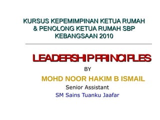 The document discusses leadership principles and provides definitions of leadership. It describes leadership as a relationship, a process of self-development that is learned, and something that makes a positive difference. It also outlines five practices of exemplary leadership: model the way, inspire a shared vision, challenge the process, enable others to act, and encourage the heart. Each practice is explained in one to two sentences.