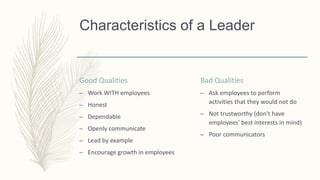 Celia outlines her leadership values, mission, and vision. Her goals are to lead by example, invest in employees, and effectively communicate. She wants to work with employees, be honest and dependable, and encourage growth. Her leadership mission is to be the best leader for herself and others, and her vision is to continue being a leader others want to work for through positive leadership behaviors.