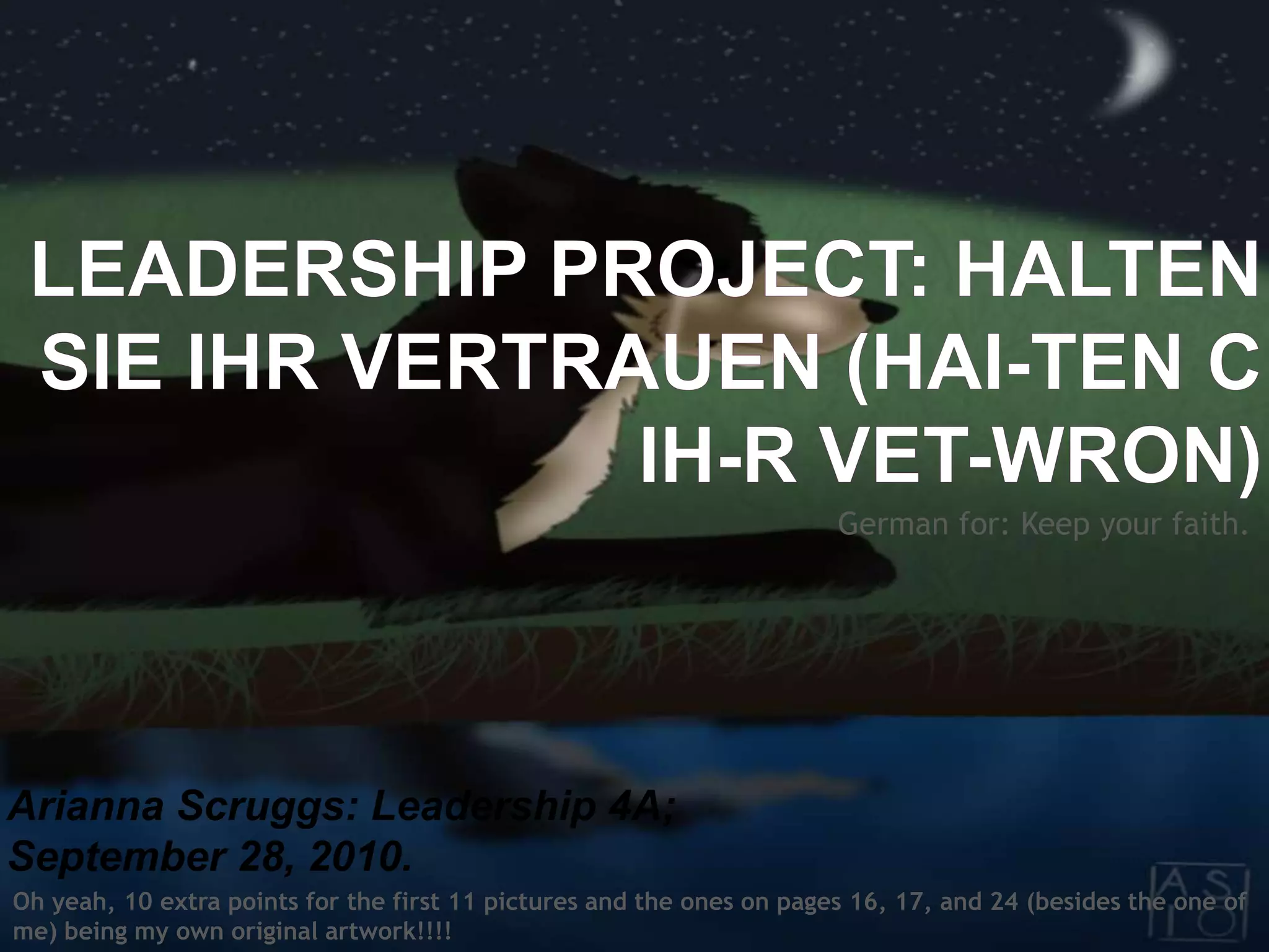 This document contains Arianna Scruggs' leadership project from September 28, 2010. It includes biographical information about Arianna, descriptions of her friends and family, details about her daily activities like drawing and writing, and lists of her favorite music, TV shows, and movies. It also discusses how Arianna wants to grow and change over the next 10 years by becoming more responsible, less lazy, calmer, and focused. The document concludes with a imagined letter from Arianna in 2030, where she discusses now being a veterinarian with a husband and child.