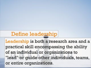 The document discusses the definition and importance of leadership, emphasizing that it differs from management and is not solely reliant on seniority or position. It outlines the traits of effective leaders in today's digital age, highlighting their role in engaging teams, fostering collaboration, and investing in talent development. Additionally, it addresses the complexities leaders face in managing engagement amidst rapid changes and challenges in the global economy.