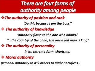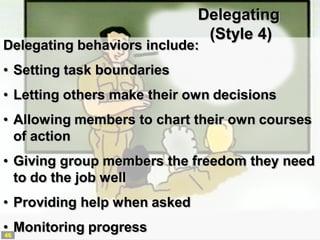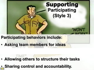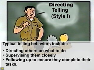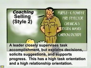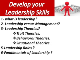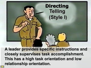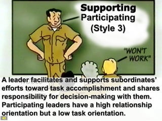 The document discusses various theories and styles of leadership. It describes trait theories that identified seven traits associated with successful leadership, including drive, desire to lead, honesty, self-confidence, intelligence, job knowledge, and extraversion. It also discusses behavioral theories and different leadership styles including autocratic, democratic, and laissez-faire. Finally, it outlines Hersey and Blanchard's situational leadership theory which argues that the most effective leadership style depends on the readiness and ability of the followers.