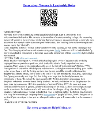 The document discusses the evolving role of women in leadership, highlighting their increasing presence in various industries and family businesses. It also explores leadership styles and the importance of emotional intelligence, emphasizing the distinction between leadership and management. Additionally, it touches on motivational theories and the personal journey of developing leadership skills.
