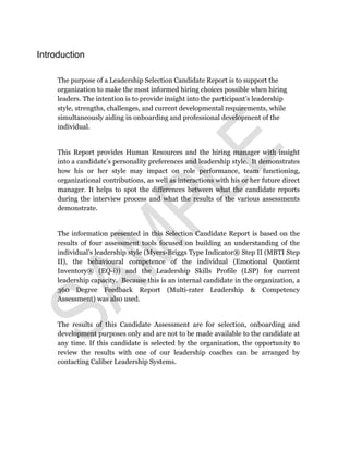 The leadership selection candidate report for Graham Goodness assesses his qualifications for the vice president of operations role, focusing on his leadership style, strengths, challenges, and development needs based on various assessments. Graham's leadership style aligns with the ESTJ personality type, characterized by dependability and a preference for structured environments, while also highlighting his adaptability and effective communication skills. The report emphasizes the importance of aligning his role with his strengths to enhance his leadership effectiveness within the organization.