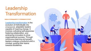 The document outlines the importance of leadership transformation as a means to develop empowered and adaptable leaders who can inspire change and drive organizational success. It emphasizes transformational leadership training, which enhances emotional intelligence and communication skills for positive impact, alongside corporate leadership training that equips executives with strategic decision-making and management capabilities. Overall, it highlights the significance of continuous learning for effective leadership.