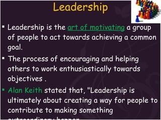 Leadership refers to the ability of an individual to influence others towards achieving a common goal. Effective leadership involves both managing tasks and developing relationships. There are various leadership styles such as authoritarian, democratic, and laissez-faire that differ in how decisions are made and involvement of group members. A leader's effectiveness also depends on contingencies like the situation and maturity of followers.