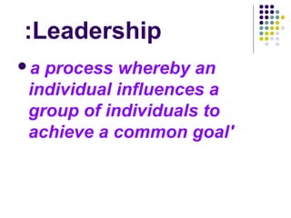 The document discusses various leadership styles including autocratic, bureaucratic, democratic, laissez-faire, team leader, coaching, task-oriented, people-oriented, transactional, and transformational. It notes that leadership involves influencing a group to achieve goals and can lift performance above normal limitations. Effective leadership realizes an additional 40% potential in people. While some are born with leadership traits, leadership can also be developed. The best leaders adapt their style to fit the task, organization, people, and time.