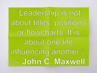 This document discusses personality development, leadership styles, group dynamics, and team building. It defines personality as unique patterns of thinking and behavior. Leadership is defined as guiding individuals or organizations, and different leadership styles like autocratic, democratic, and transformational are described. Group dynamics involve how people interact in groups and strategies to strengthen dynamics include defining roles and improving communication. Team building enhances social relations, roles, and turns individuals into cohesive teams through activities, collaboration, and communication.