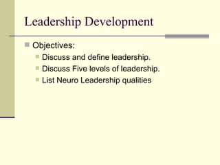 The document discusses leadership development and defines leadership. It outlines five levels of leadership and lists qualities of neuroleadership. The five levels are: position/rights, permission/relationship, production/results, people development/reproduction, and personhood/respect. The document also discusses developing attitudes, problem solving approaches, developing people skills as a leader, and creating a vision for a leadership team.