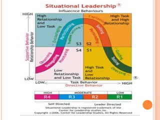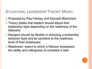 1. Situational Leadership Theory proposed by Hersey and Blanchard which states leaders should adjust their style based on follower readiness. There are four styles - telling, selling, participating, and delegating.