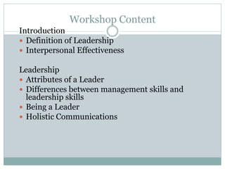 The document provides an overview of concepts related to leadership including definitions of leadership and management, attributes of effective leaders, differences between leadership and management skills, and techniques for developing interpersonal skills and building high-performing teams. It discusses personality types, motivating employees using Maslow's hierarchy of needs, and approaches for effective communication, conflict management, and problem solving.