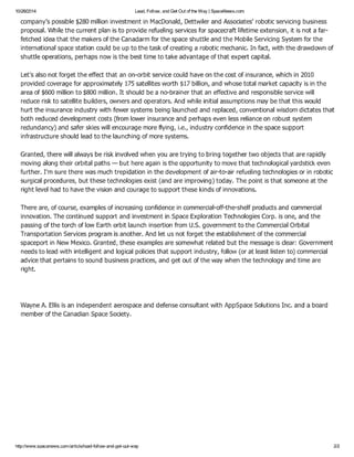 The document discusses how governments need to support commercial space initiatives and get out of the way of innovation. It argues that only businesses can create sustainable growth and jobs. Specifically, it says governments should remove barriers to commercial-off-the-shelf technologies and support commercial business proposals, using robotic satellite servicing as an example of a promising commercial idea held back by lack of policy support. It concludes that governments need intelligent policies that support industry and commercial advice, and let businesses lead when the technology is ready.