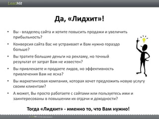 Лидхит - это профессиональная маркетинговая платформа в России, предназначенная для повышения продаж и прибыльности сайтов через эффективное управление лидами и рекламными кампаниями. Платформа предлагает комплексные инструменты, включая SEO, SMM, email-маркетинг и аналитику, позволяя пользователям оптимизировать бюджет и увеличить конверсию. Лидхит также предоставляет бесплатный тестовый период для ознакомления с функционалом и поддержкой личного менеджера.