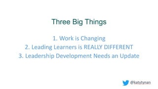 1. The document discusses how work and leadership are changing as work becomes more complex, teams more diverse, customers more dispersed, and technology advances faster. This requires updating how we prepare leaders for their new roles of leading learners.