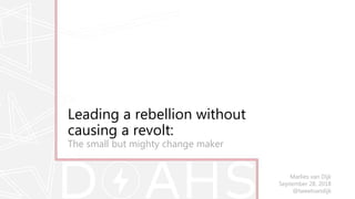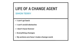 The document discusses strategies for leading change without inciting a backlash, referencing various leadership theories and examples. It emphasizes the importance of connecting with people's emotions, leveraging opportunities, and fostering authentic engagement. Additionally, it highlights the role of small change-makers in driving significant impact.