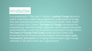 John Kotter's 'Leading Change' outlines an eight-step process for organizational transformation, emphasizing the importance of emotional engagement in change efforts. The method involves establishing urgency, forming a guiding coalition, creating a vision, empowering action, and managing short-term wins, ultimately leading to sustainable change. The subsequent works, including 'The Heart of Change' and its field guide, equip leaders with practical tools to implement these strategies effectively.