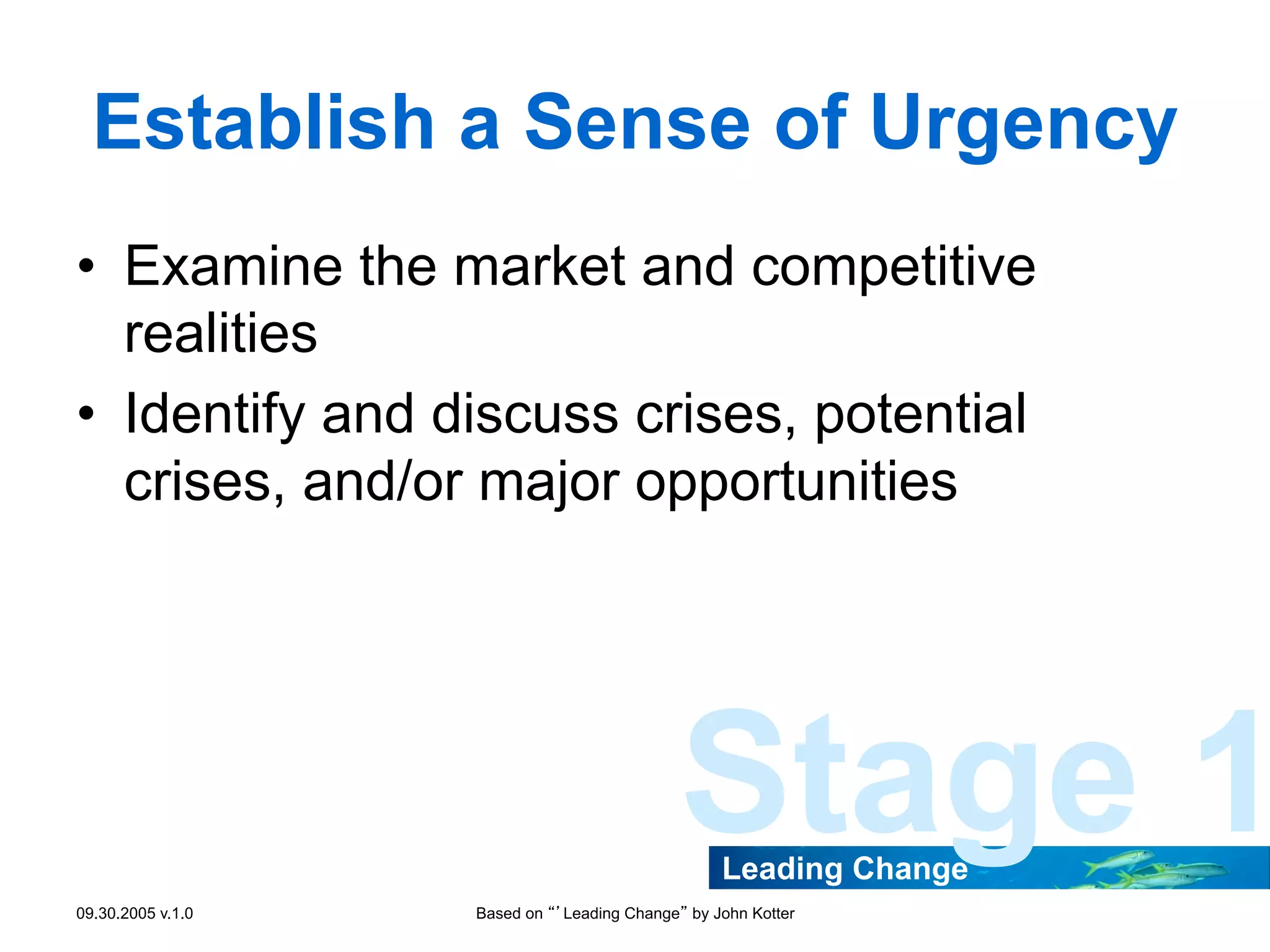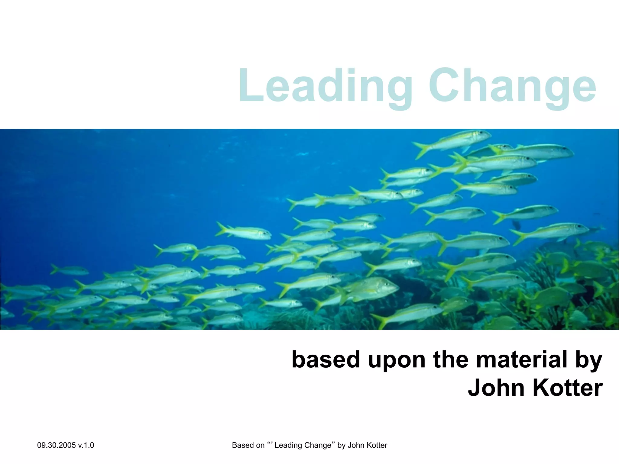 The document outlines John Kotter's 8-stage process for leading organizational change. The 8 stages are: 1) establish a sense of urgency, 2) create a guiding coalition, 3) develop a vision and strategy, 4) communicate the change vision, 5) empower broad-based action, 6) generate short-term wins, 7) consolidate gains and produce more change, and 8) anchor new approaches in the culture. The first 6 stages build momentum for change, while stages 7-8 focus on ensuring the changes stick and become embedded in the organizational culture.