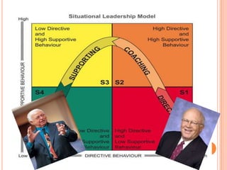 The document discusses various approaches and styles of leadership. It describes leadership as influencing others to work towards organizational goals. Leaders can influence others through different bases of power such as legitimate, reward, coercive, referent, and expert power. Leadership styles discussed include employee-oriented, task-oriented, participative, free-rein, autocratic, and consultative. Contingency approaches consider which leadership practices are appropriate for different situations. The path-goal model also examines how leadership impacts motivation.