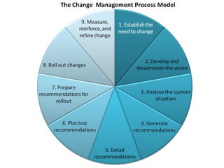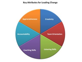 The document discusses key attributes for leading change, including being creative, team-oriented, a good listener, and providing coaching, accountability, and appreciation. It also presents a behavioral change model for becoming an effective change leader, which involves raising awareness of needed improvements, developing a desire to change, acquiring new skills, applying those skills daily, receiving feedback, and forming new habits.