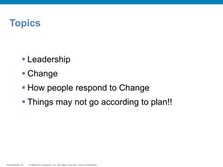 The document discusses leadership in the context of change management, emphasizing that leadership is a key factor for success in any mission. It presents different types of change and outlines the emotional responses individuals may have during the change process, including models like the Bridges model and the change curve. Additionally, it highlights the importance of setting realistic expectations and providing support to teams navigating these changes.