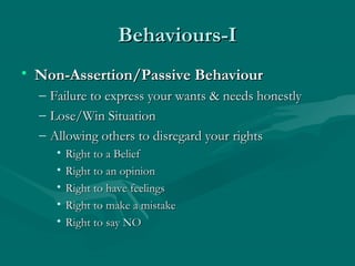 This document discusses empowering teams through assertive leadership and negotiation. It describes passive, aggressive, and assertive behaviors and provides tips for being assertively such as describing issues, expressing feelings, and specifying wants. Negotiation strategies like reciprocity and reason are outlined. Methods to counter influencing attempts and overcome blocks to empowerment are also presented. The key is empowering oneself and others through believing in shared capabilities, freedom of choice, and responsibility while maintaining role clarity.