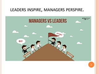 The document discusses the distinctions between leadership and management, highlighting that leaders inspire and innovate, while managers focus on organization and control. It outlines the roles, traits, and responsibilities of both, emphasizing how leaders foster trust and vision, whereas managers concentrate on meeting objectives. Ultimately, effective leadership is characterized by the ability to inspire and engage employees, while management is centered around maintaining established processes.