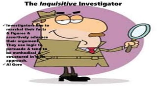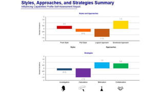 The document discusses various styles of influence used by leaders, emphasizing that effective influencing involves ethical persuasion and emotional engagement. It outlines four influencing capabilities: the Inquisitive Investigator, the Clear Calculator, the Mindful Motivator, and the Collegial Collaborator, each serving different contexts and audiences. The text promotes a comprehensive toolkit for enhancing personal influence and optimizing team performance, highlighting practical applications in leadership.
