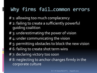 The document summarizes John Kotter's eight steps for leading change: 1) establishing a sense of urgency, 2) creating a guiding coalition, 3) developing a vision and strategy, 4) communicating the change vision, 5) empowering broad-based action, 6) generating short-term wins, 7) consolidating gains and producing more change, and 8) anchoring new approaches in the culture. It provides details on why change efforts fail and how to successfully lead organizational change through establishing a vision, communicating effectively, empowering others, and institutionalizing changes.