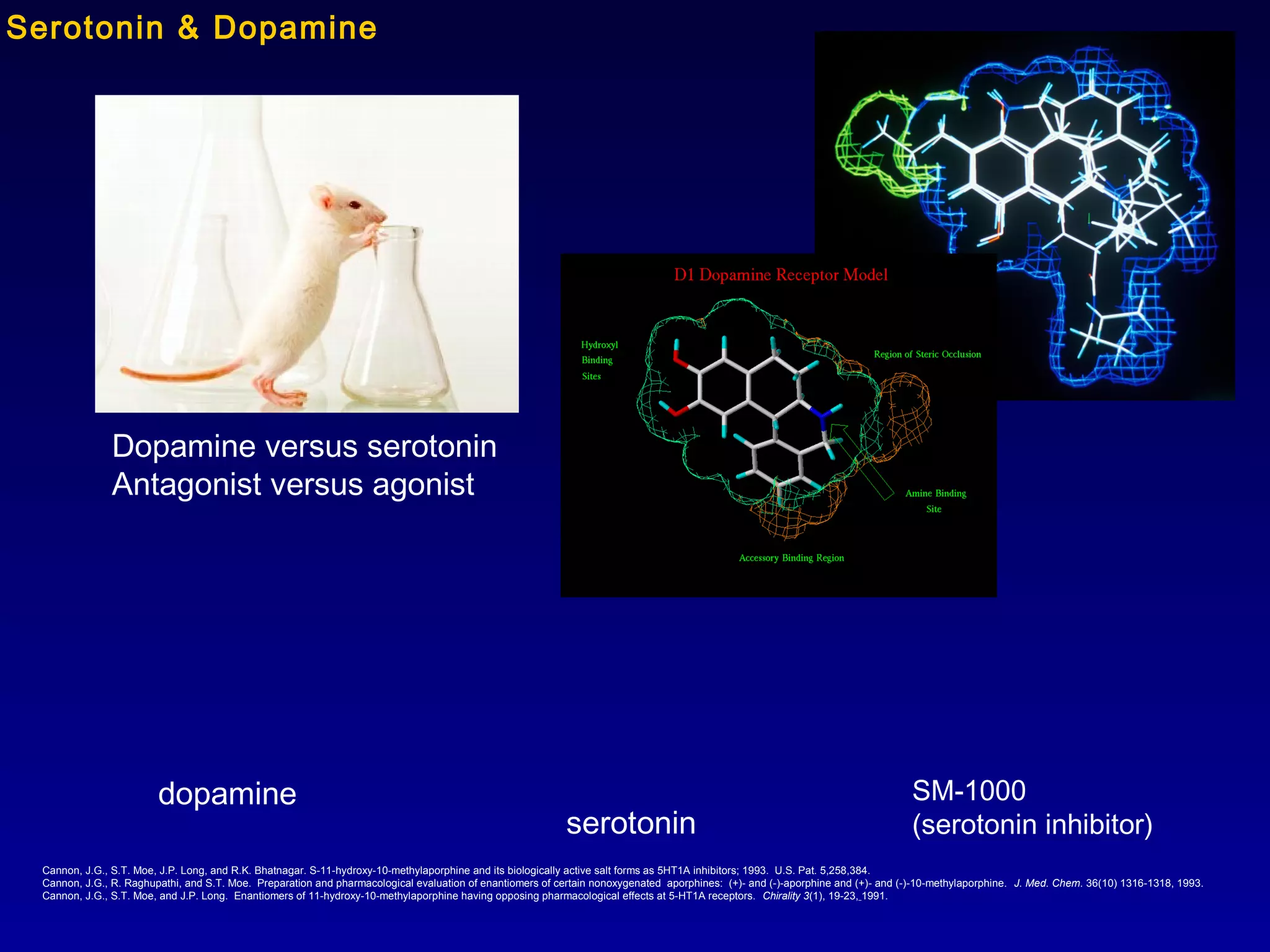 This document summarizes research from several publications investigating compounds that act on serotonin, dopamine, opioid, and calcium receptor systems. It describes the synthesis and evaluation of analogs of aporphine, an alkaloid, examining their effects on serotonin and dopamine receptors. It also discusses the development of opioid receptor agonists and antagonists through stereospecific synthesis and evaluation of derivative compounds. Finally, it mentions the development of cinacalcet and other calcium sensing receptor modulators for the treatment of hyperparathyroidism.