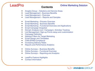 The document describes the features and benefits of LeadPro, a lead management, email marketing, and online surveys platform. It provides an overview of the key capabilities including lead capture, qualification and distribution, email campaign creation and delivery, list management, and online survey tools. It also outlines the business benefits of increased lead generation, sales conversion and customer retention through an integrated marketing automation solution.