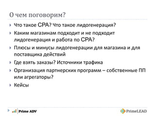 Документ обсуждает модель CPA и лидогенерацию для интернет-магазинов, рассматривая их преимущества и недостатки для магазинов и подрядчиков. Основное внимание уделяется источникам трафика, организации партнерских программ, а также практическим примерам и кейсам использования этих моделей в рекламных кампаниях. Автор делится стратегиями оптимизации и оценки эффективности расходов на привлечение клиентов.