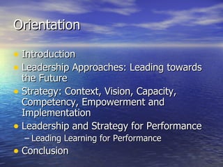 The document discusses various approaches to leadership, strategy, and performance management. It covers leadership theories including trait, behavioral, situational, and transformational approaches. It also discusses developing strategy through understanding context, vision, capacity, and empowerment. Key elements of transformational leadership and social learning approaches are outlined. The importance of leadership, learning, and using learning to continuously improve performance is emphasized. Leaders are encouraged to facilitate rather than direct learning, and create learning organizations through building commitment, capacity, and empowerment.