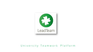 The document provides information about a university teamwork platform called LeadTeam. It includes graphs and charts from customer validation research showing that university students currently use multiple platforms for teamwork and find the process time-consuming. The document outlines LeadTeam's minimum viable product, marketing plan, and revenue models. It also compares LeadTeam to competitors like Facebook, Google Drive, Dropbox, and Evernote on features and strengths/weaknesses.