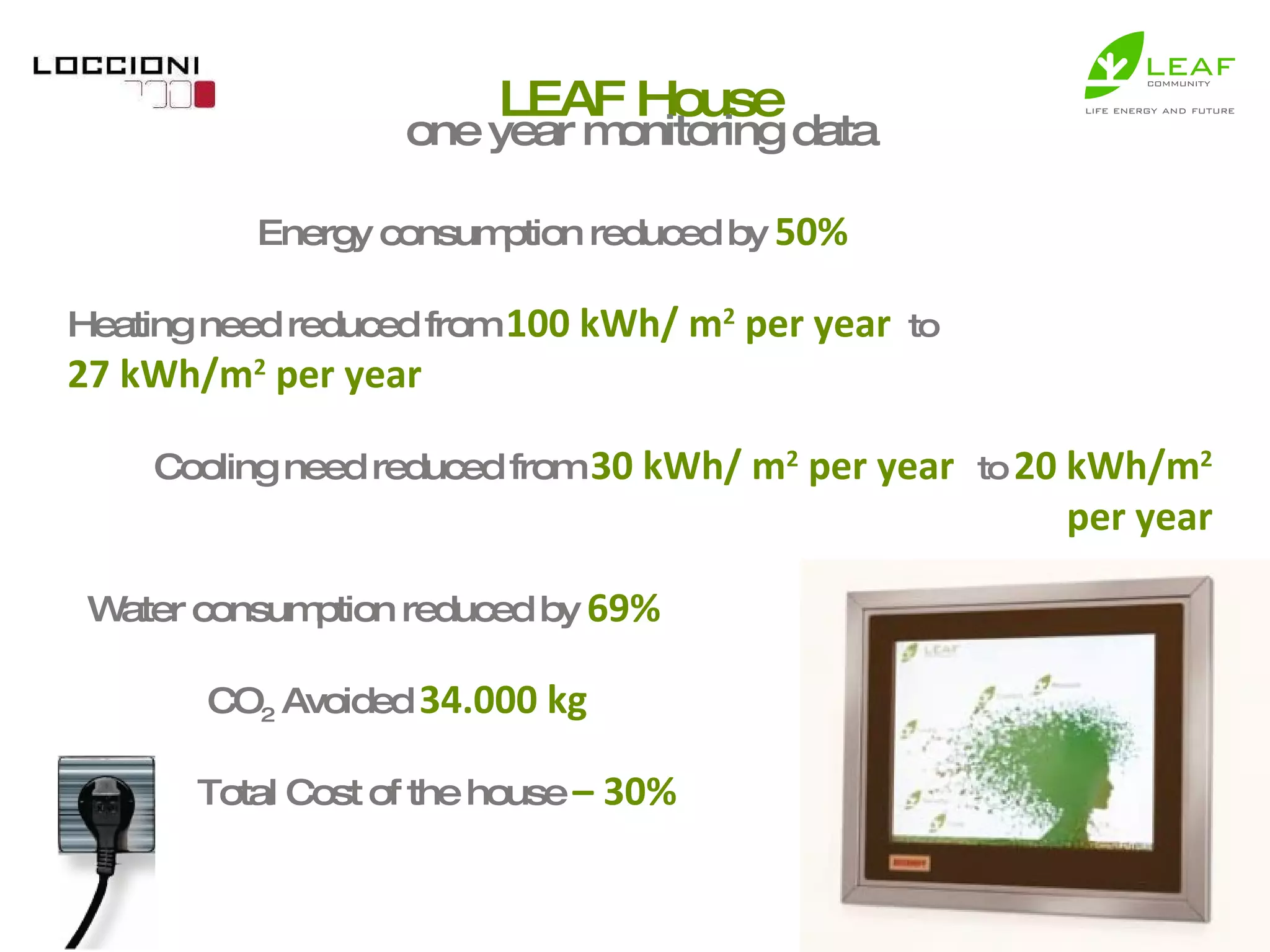 The LEAF House is a net zero building composed of six apartments that produces as much energy annually from renewable sources as it consumes. Monitoring of the house found that it reduced energy and water consumption by 50% and 69% respectively compared to a standard building, while maintaining comfort for residents. The LEAF House integrates sustainability and energy efficiency solutions like solar power, geothermal heating, and real-time consumption monitoring. It is part of the larger LEAF Community, the first sustainable community in Italy, which aims to demonstrate renewable energy and sustainable living.