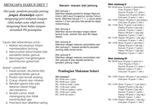 Dokumen tersebut memberikan informasi tentang berbagai diet untuk penderita penyakit jantung, mulai dari diet jantung I untuk penderita yang sakit parah hingga diet jantung IV untuk penderita ringan. Diet-diet tersebut dirancang untuk memenuhi kebutuhan gizi yang seimbang serta mudah dicerna, dengan kandungan kalori, protein, lemak, garam, dan bahan makanan yang dibatasi sesuai kondisi medis pasien. Dokumen juga menjelask