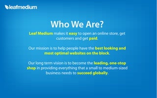 Leaf Medium aims to become a leading one-stop shop for small businesses by making it easy to build an online store and get customers. Their product allows anyone to create a store in minutes through a clean, simple interface. They plan to scale through viral integrations and strategic partnerships. While competitors' tools are outdated and difficult to use, Leaf Medium offers automated hosting and sales support. They are currently profitable and seeking $300k-$1m in seed funding to accelerate growth.
