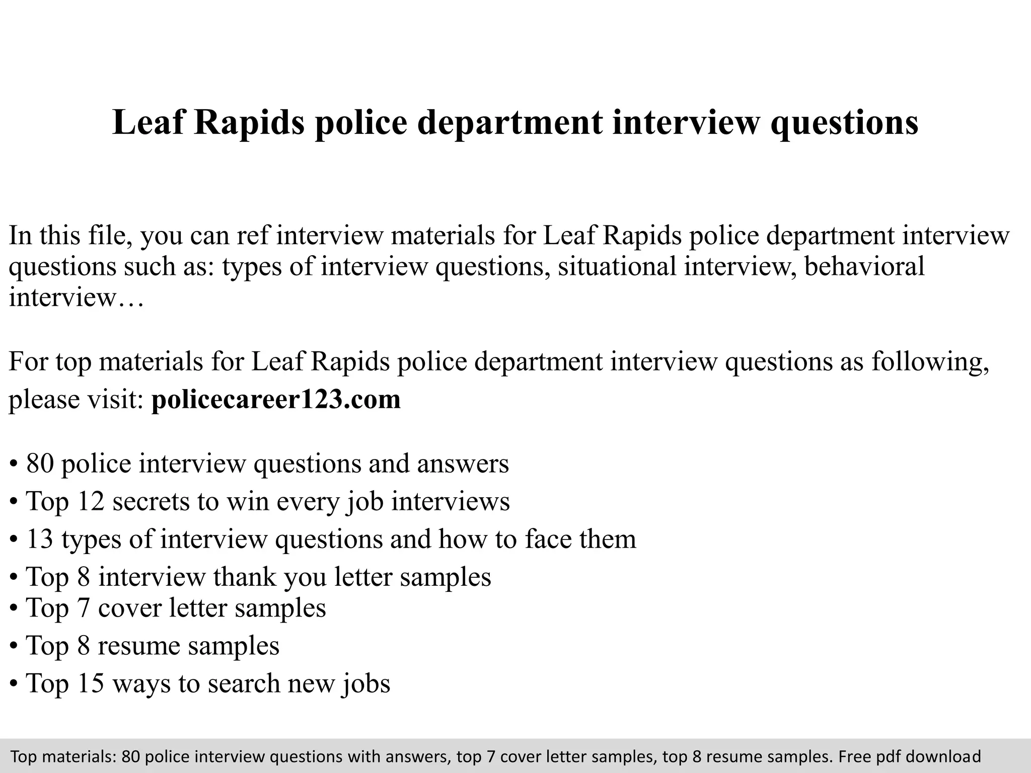 The document provides resources for preparing for a Leaf Rapids police department job interview, including 80 police interview questions and answers, top cover letter and resume samples, and tips on different types of interview questions. It recommends visiting the website policecareer123.com which offers free downloadable PDFs on interview preparation materials like common questions, sample responses, and best practices for conducting oneself in an interview. The document also provides example answers to some specific questions often asked in police interviews.