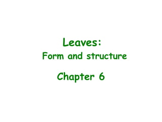 Leaves are the primary structures for photosynthesis in most plants, consisting of a blade and petiole, with variations between monocots and dicots in vein arrangement. The document describes the anatomy of leaves, including the cuticle, epidermis, mesophyll, stomates, and vascular tissues (xylem and phloem), as well as mechanisms for stomatal control based on water availability. Additionally, it highlights specialized leaves, such as the Venus flytrap, which manage turgor pressure for their unique trapping function.